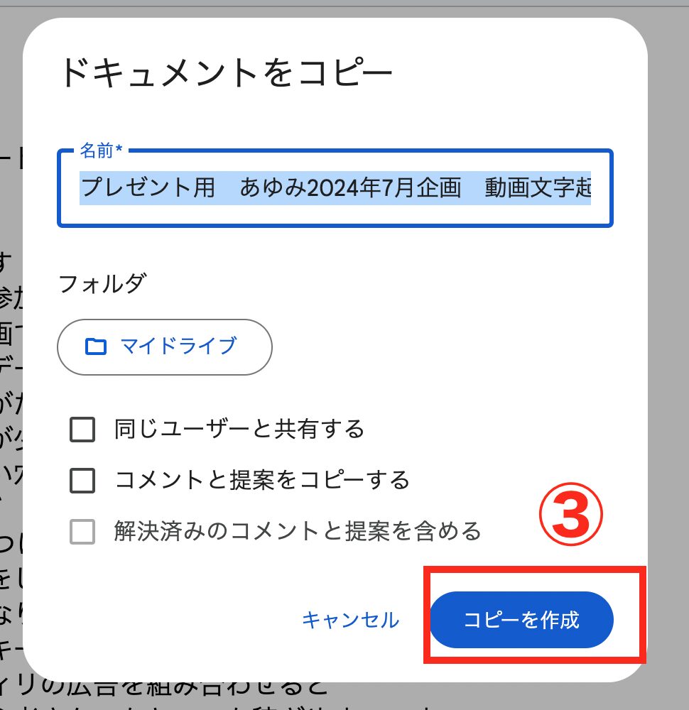 ②「コピーを作成」をクリック